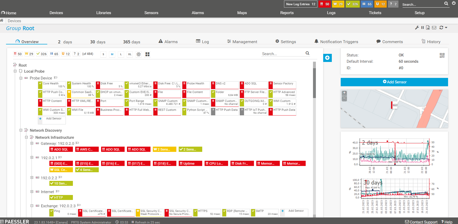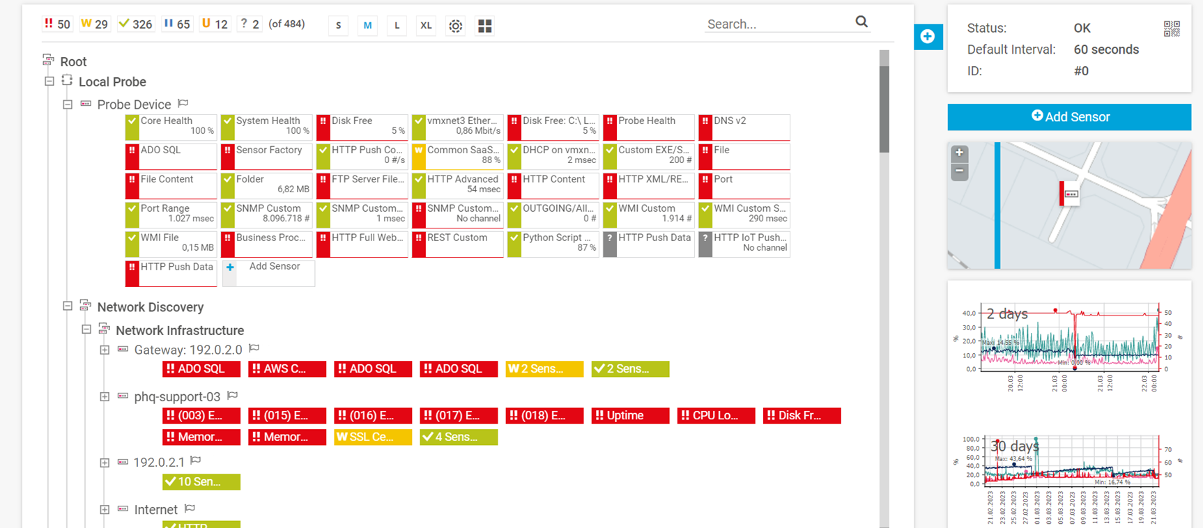 By default, PRTG Network Monitor creates a probe device on the local probe or on the hosted probe (PRTG Hosted Monitor). The probe device represents the probe system. PRTG automatically monitors the system health of the PRTG core server and each probe to discover overload that might distort monitoring results. To monitor the status of the probe system, PRTG automatically creates the following sensors: