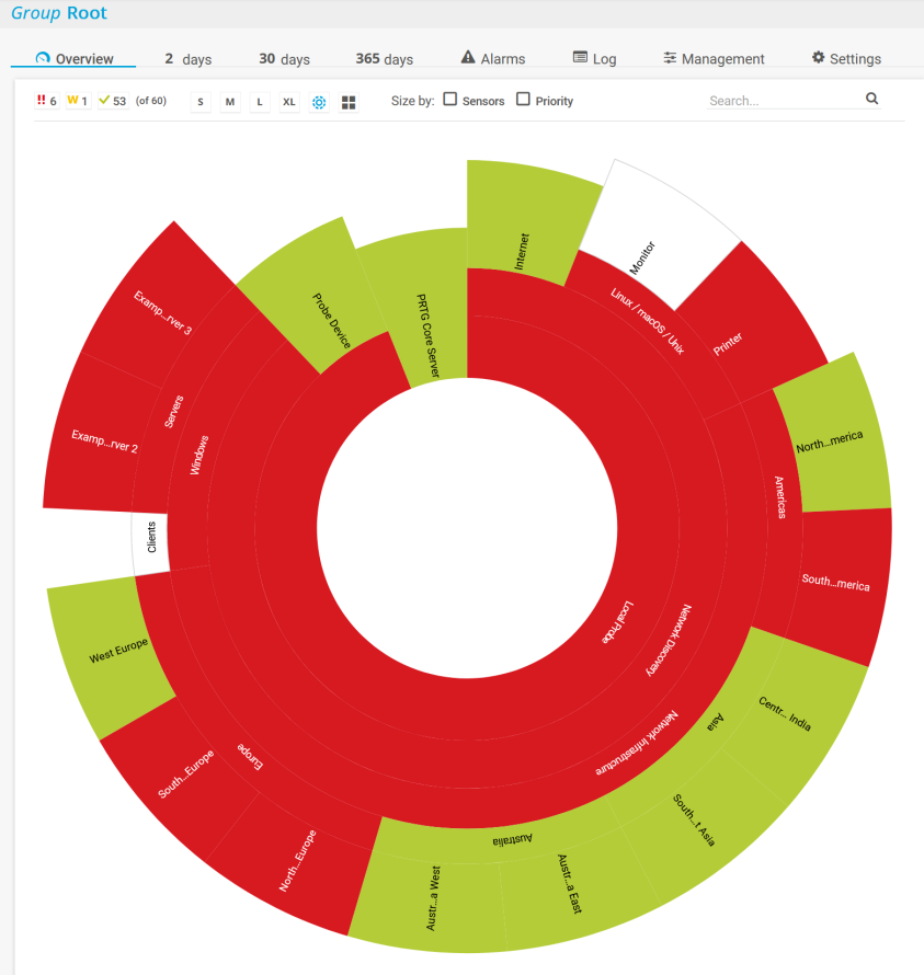 There are two additional options to the classic device tree view with which you can display the status of all sensors of your entire installation in a single overview. Click to change to the sunburst view. To change to the tree map view, click .