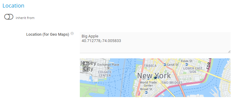 You can define your own labels for locations of objects. To do so, enter the desired label in the first line of the Location (for Geo Maps) field in an object's settings and provide the geo coordinates of the location in the second line. The object appears with the defined label in geographical maps. It is also possible to define the same label for different locations as long as the coordinates differ from each other.