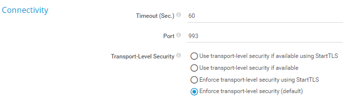 Enforce transport-level security (default): Try to connect to the server via an SSL/TLS-secured connection. If the server does not support this, the sensor shows the Down status.