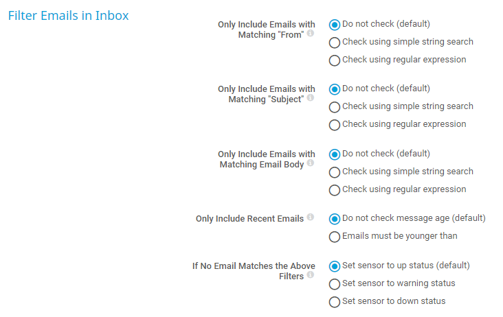 If email is older than: Set the sensor to the Warning status if the found email is older than you define below.