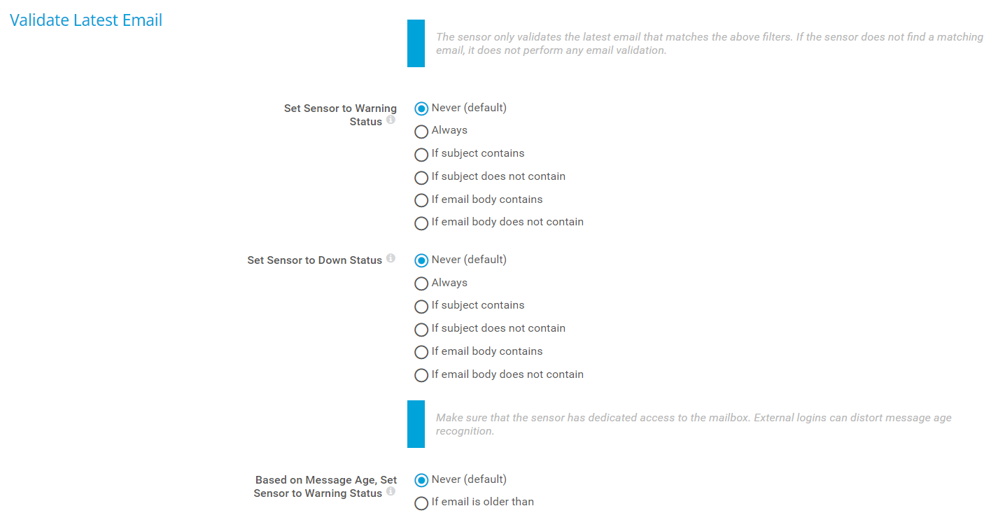 The sensor only validates the latest email that matches the above filters. If the sensor does not find a matching email, it does not perform any email validation.