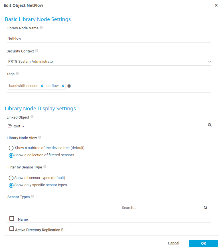 • When you select Show a collection of filtered sensors, PRTG only shows the sensors that are underneath the Linked Object in the device tree without probes, groups, and devices. You can additionally filter for certain sensor types, states, and tags. PRTG then only shows matching sensors. In the example screenshot, you can see the library node My Sub Tree where only bandwidth sensors are shown.