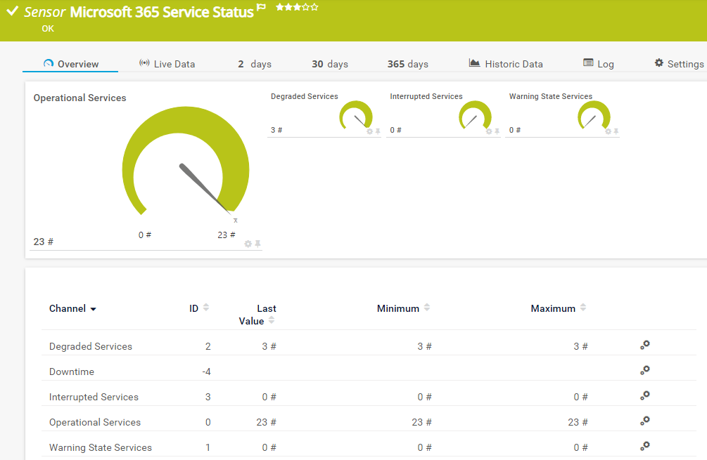 The Microsoft 365 Service Status sensor monitors the overall status of all services of a Microsoft 365 subscription.