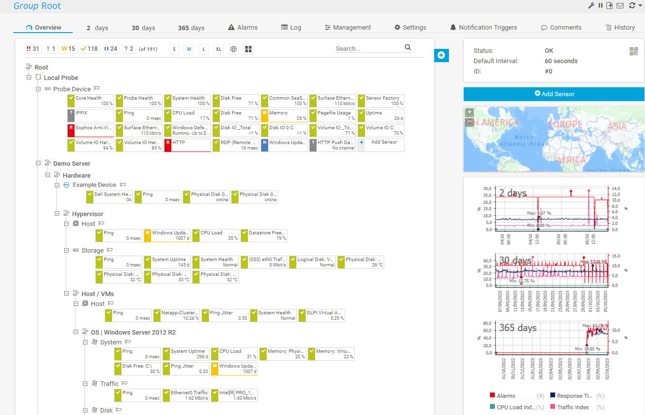 The root group is the topmost instance in PRTG. It contains all other objects in your setup. We recommend that you adjust all default settings for the root group. This is because all other objects in the device tree inherit these standard settings by default so that you do not need to set up the same configuration for each object anew.