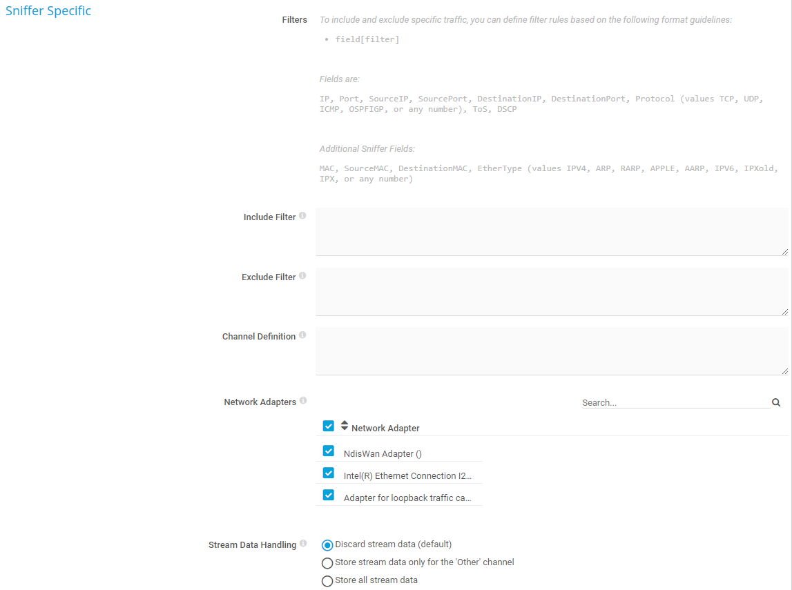 Define if you want to filter any traffic. If you leave this field empty, the sensor includes all traffic. To include specific traffic only, define filters using a special syntax.