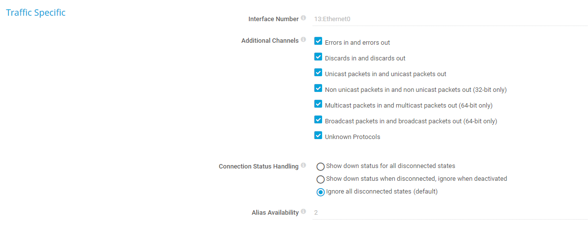 Show down status when disconnected, ignore when deactivated: Show the Down status for a disconnected interface only if it is not deliberately deactivated in the configuration. This applies if the ifOperStatus of the interface is not "up" and the ifAdminStatus is "up". The sensor stays in the Up status when the interface has been deactivated.