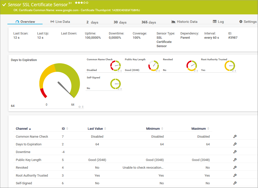 Store result: Store the last sensor result to the \Logs\sensors subfolder of the PRTG data directory on the probe system. The file names are Result of Sensor [ID].Data.txt, Result of Sensor [ID] (Certificate 0 in Certificate Chain).cer, Result of Sensor [ID] (Certificate 1 in Certificate Chain).cer, Result of Sensor [ID] (Certificate 2 in Certificate Chain).cer, Result of Sensor [ID] (Certificate Chain).txt, and Result of Sensor [ID] (Certificate).cer. This setting is for debugging purposes. PRTG overwrites these files with each scanning interval.