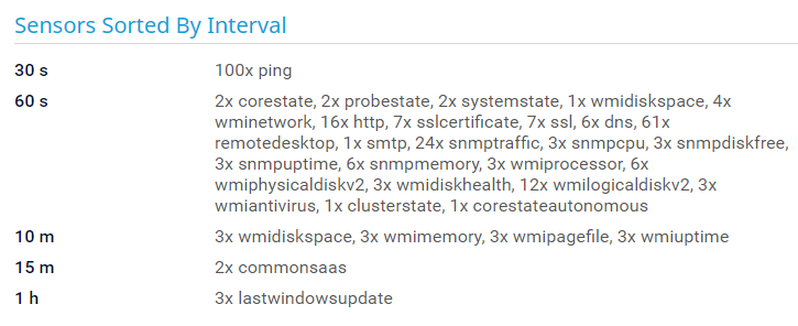 This section shows all sensors that you use in your configuration in order of performance impact (from very low to very high). If the CPU load of the probe system is very high, you can see which sensors might be causing this issue. Consider the recommended number of sensors in the respective sections for sensors with a high or very high performance impact.